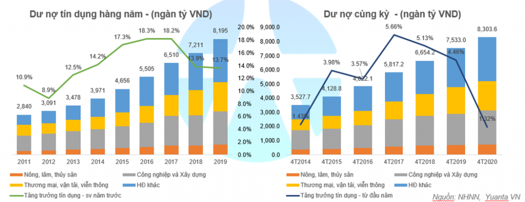 Tăng trưởng tín dụng 4 tháng đầu năm 2020 đạt 1.32%, thấp hơn nhiều so với mức 4.46% của 4 tháng 2019. Mặc dù việc giảm lãi suất điều hành lần 1 bắt đầu từ ngày 17/3 và cũng đã có những gói hỗ trợ đưa vào nền kinh tế nhưng tăng trưởng tín dụng từ đầu năm vẫn rất thấp. Điều này là do ảnh hưởng bởi dịch và việc cách ly xã hội diễn ra trong hơn nửa đầu tháng 4.