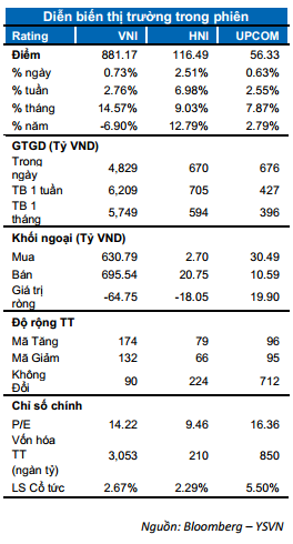 Thị trường ghi nhận phiên tăng điểm với thanh khoản sụt giảm. Chỉ số VN-Index chốt phiên tăng 0.73% đóng cửa tại 881.17 điểm. Chỉ số HNX-Index tăng mạnh 2.51% neo tại 116.49 điểm. Chỉ số Upcom-Index cũng đồng thuận tăng 0.63%. Giá trị giao dịch khớp lệnh toàn thị trường sụt giảm về mức 5,300 tỷ đồng nhưng vẫn ở mức cao.