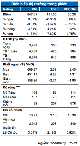 Phiên giao dịch cuối tuần ghi nhận sự biến động hẹp của các chỉ số TTCK Việt Nam. Chỉ số VN-Index giao dịch tích cực hơn khi tăng 0.62% đóng cửa tại 847.61 điểm. Chỉ số HNX-Index giảm nhẹ về cuối phiên với mức giảm 0.05% neo tại 111.55 điểm; chỉ số Upcom-Index tăng 0.66% trong phiên hôm nay. Giá trị giao dịch khớp lệnh toàn thị trường sụt giảm 3,300 tỷ đồng cho thấy dòng tiền vẫn đứng ngoài quan sát.