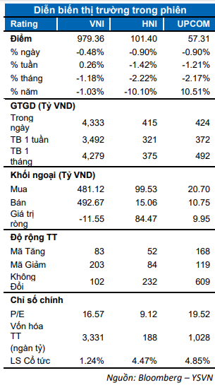Sau kỳ nghỉ lễ, lực bán trên diện rộng khiến VN-Index đóng cửa giảm 0.48% dừng tại 979.36 điểm. Chỉ số HNX-Index giảm mạnh hơn khi mất 0.89% chốt tại 101.4 điểm, chỉ số Upcom-Index cũng đồng thuận giảm 0.9% dừng tại 57.31 điểm. Dòng tiền không có nhiều thay đổi khi đạt hơn 3,000 tỷ đồng trên toàn thị trường (chỉ tính giao dịch khớp lệnh).