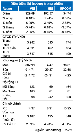 Thị trường tiếp tục giao dịch cần bằng trong phiên hôm nay. Tâm lý thị trường tích cực hơn nhờ nhóm Ngân hàng khởi sắc. Chỉ số VN-Index đóng cửa tăng nhẹ 0.1% dừng tại 929.09 điểm. Chỉ số HNX -Index tăng khá mạnh 1.25% chốt tại 102.57 điểm. Điểm trừ là giá trị giao dịch khớp lệnh sụt giảm 27% so với phiên liền trước đạt hơn 3,700 tỷ đồng.