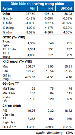 Thị trường xóa bỏ gần hết mức tăng của phiên liền trước. Cụ thể, chỉ số VN-Index giảm 0.49% dừng tại 987.59 điểm. Chỉ số HNX-Index giảm nhẹ 0.05% neo tại 105.16. Chỉ số Upcom-Index tương tự cũng mất 0.39% chốt tại 56.93 điểm. Giá trị giao dịch khớp lệnh toàn thị trường đạt mức 3,700 tỷ đồng.