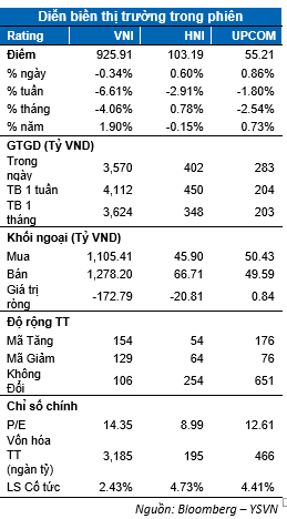 Thị trường tiếp tục giằng co đi ngang trong biên độ hẹp với thanh khoản tiếp tục sụt giảm. Chỉ số VN-Index dao động trong biên độ 920-936 điểm chốt phiên tại 925.91 điểm giảm 0.34%. Chỉ số HNX-Index tiếp tục duy trì mạch tăng tốt với mức tăng 0.6% chốt tại 103.19 điểm. Giá trị giao dịch khớp lệnh tiếp tục sụt giảm nhẹ đạt 3,500 tỷ đồng.