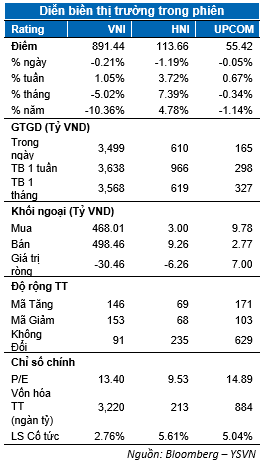 Chỉ số VN-Index giằng co mạnh phiên cuối tuần nhưng thu hẹp đà giảm về cuối phiên khi chỉ còn giảm 0.21% đóng cửa tại 891.44 điểm. Chỉ số HNX-Index giảm 1.19% đóng cửa tại 113.66 điểm trong khi Upcom-Index giảm nhẹ. Giá trị giao dịch khớp lệnh giảm mạnh khi chỉ đạt 3,300 tỷ đồng toàn thị trường.