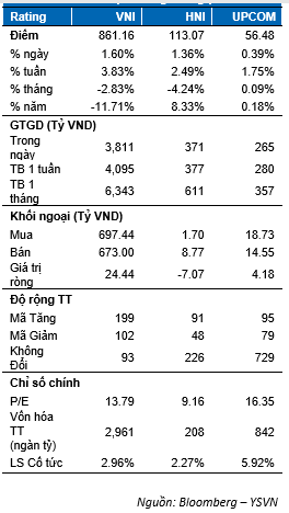 Các chỉ số TTCK Châu Á có mức tăng khá mạnh trong đố nổi bật 2 chỉ số của TT Trung Quốc gồm Shanghai Composite(+5.71%), Hang Seng(+3.81%). TTCK Việt Nam tương đồng với đà tăng càng được mở rộng về cuối phiên. Chỉ số VN-Index tăng 1.6% đóng cửa tại 861.16 điểm. Chỉ số HNX-Index tăng 1.37% neo tại 113.07 điểm; chỉ số Upcom-Index cộng thêm 0.39%. Giá trị giao dịch khớp lệnh toàn thị trường đạt 3,800 tỷ đồng tăng 15% so với phiên cuối tuần đang là tín hiệu tích cực của dòng tiền.