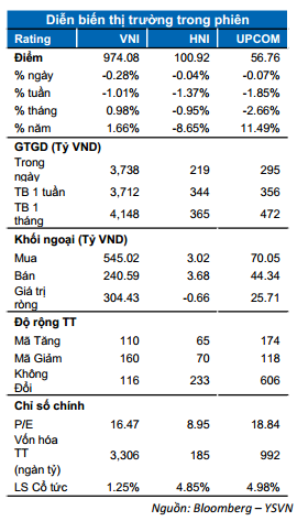 Trái ngược với đà tăng mạnh của thị trường chứng khoán khu vực và chứng khoán Mỹ, thị trường Việt Nam giao dịch khá ảm đạm khi chỉ số VN-Index có phiên giảm điểm thứ 2 liên tiếp với mức giảm 0.28% dừng tại 974.08 điểm. Chỉ số HNX-Index giảm nhẹ 0.05% chốt tại 100.92 trong khi chỉ số Upcom-Index mất 0.07% dừng tại 56.76 điểm. Điểm tích cực là mặc dù giảm điểm nhưng thanh khoản không cao với tổng giá trị khớp lệnh đạt 2,536 tỷ đồng khớp lệnh trên cả ba sàn.
