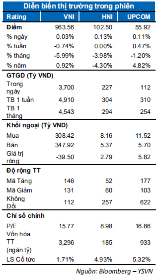 Thị trường biến động hẹp trong phiên cuối tuần nhưng theo hướng cân bằng mặc dù đây là phiên lượng cổ phiếu bắt đáy về tài khoản. Các chỉ số chốt giữ trên vùng giá xanh, chỉ số VN-Index đóng cửa tăng 0.03% dừng tại 963.56 điểm, HNX-Index tăng 0.13% chốt tại 102.5 điểm trong khi Upcom cũng tăng nhẹ. Dòng tiền tiếp tục suy yếu khi giá trị giao dịch khớp lệnh toàn thị trường chỉ đạt mức gần 3,450 tỷ đồng.