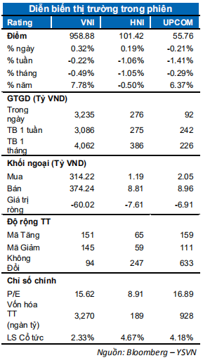 Chỉ số VN-Index hồi phục khi tiệm cận vùng đáy cũ quanh 850 điểm. Chỉ số đóng cửa tăng 0.32% dừng tại 958.88 điểm. Tương tự, chỉ số HNX-Index tăng nhẹ 0.18% neo tại 101.42 điểm trong khi Upcom-Index ngược lại giảm 0.37% chốt tại 55.67 điểm. Dòng tiền tiếp tục suy yếu khi giá trị giao dịch khớp lệnh sụt giảm 10% so với phiên liền trước đạt mức 2,650 tỷ đồng khớp lệnh trên cả 3 sàn.