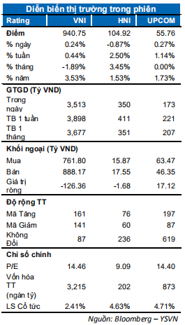 Các chỉ số thị trường giao dịch cân bằng trong phiên cuối tuần. Chỉ số VN-Index tăng nhẹ 0.24% chốt phiên tại 940.75 điểm. Chỉ số HNX-Index yếu hơn khi giảm tới 0.87% dừng tại 104.92 điểm. Giá trị giao dịch khớp lệnh sụt giảm 15% so với phiên liền trước đạt hơn 3,550 tỷ đồng.