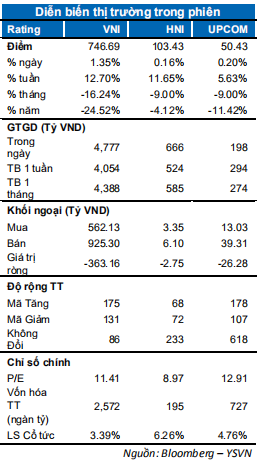 Các chỉ số ghi nhận phiên tăng thứ 4 liên tiếp nhưng biên độ tăng đang thu hẹp dần. VN-Index chốt phiên với mức tăng 1.35% đóng cửa tại 746.69 điểm. Chỉ số HNX-Index tăng 0.16% đóng cửa tại 103.43 điểm trong khi Upcom-Index cũng đồng thuận tăng 0.19%. Giá trị giao dịch khớp lệnh tiếp tục tăng so với phiên liền trước đạt gần 4,900 tỷ đồng toàn thị trường.