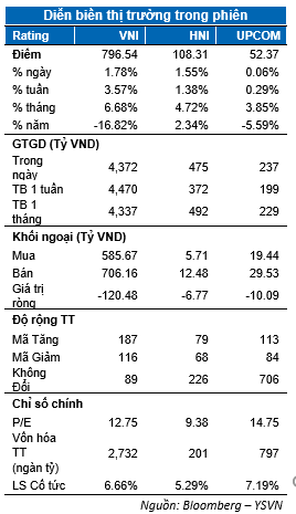 Thị trường tiếp tục có chuỗi phiên tăng mạnh trong 2 phiên gần đây. Chỉ số VN-Index đóng cửa tăng 1.78% dừng tại 796.54 điểm. Chỉ số HNX-Index tăng 1.55% neo tại 108.31 điểm; chỉ số Upcom-Index chỉ tăng nhẹ. Giá trị giao dịch khớp lệnh toàn thị trường tiếp tục tăng đạt mức 4,200 tỷ đồng.