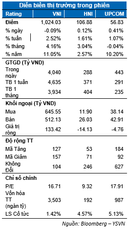 Thị trường đi ngang trong biên độ hẹp. VN-Index chốt phiên tại 1024.03 điểm giảm nhẹ 0.09%. Chỉ số HNX-Index tăng nhẹ 0.13% dừng tại 106.88 điểm. Chỉ số Upcom-Index tăng mạnh 0.42% chốt tại 56.83 điểm. Dòng tiền tiếp tục suy yếu với giá trị giao dịch khớp lệnh chị đạt hơn 3,800 tỷ đồng trên toàn thị trường