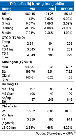 VN-Index có phiên đảo chiều tăng cần thiết sau phiên xuyên thủng ngưỡng 950 điểm trong phiên liền trước. Chỉ số đóng cửa tăng 1.18% dừng tại 960.15 điểm gần mức cao nhất trong ngày. Tương tự, chỉ số HNX-Index tăng 0.92% neo tại 101.25 điểm, Upcom-Index chỉ tăng nhẹ. Giá trị giao dịch khớp lệnh toàn thị trường đạt mức 2,620 tỷ đồng.