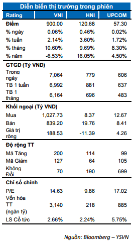 TTCK Việt Nam sau nhịp rớt khá sâu đầu phiên khi VN-Index giảm gần 10 điểm đã dần hồi phục trở lại cho tới lúc đóng cửa. Chỉ số đóng cửa tăng nhẹ 0.06% dừng tại 900 điểm. Chỉ số HNX-Index tăng tốt hơn 0.46% dừng tại 120.68 điểm; chỉ số Upcom-Ingdex tăng không đáng kể. Giá trị giao dịch khớp lệnh toàn thị trường duy trì ở mức cao gần 7,500 tỷ đồng.