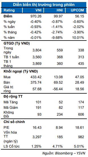 Tâm lý thận trọng chi phối thị trường khiến các chỉ số tiếp tục điều chỉnh. Chỉ số VN-Index giảm 0.4% đóng cửa tại 970.26 điểm, chỉ số HNX-Index cũng mất 0.87% dừng tại 99.97 điểm trong khi Upcom-Index trượt 0.61% neo tại 56.15 điểm. Giá trị giao dịch gia tăng lên mức 3,500 tỷ đồng cho thấy bên bán chiếm thế chủ động trong phiên.