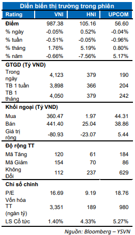 VN-Index giằng co mạnh ở hai chiều cung cầu. Chỉ số chốt phiên giảm nhẹ 0.45% dừng tại 987.38 điểm khi lực bán tái diễn trong phiên chiều. Chỉ số HNX-Index ngược lại có phiên tăng thứ 3 liên tiếp với mức tăng 0.51% tạm dừng ở 105.16 điểm. Chỉ số Upcom-Index giảm nhẹ 0.02% chốt tại 56.6 điểm. Dòng tiền tiếp tục suy yếu khi giá trị giao dịch khớp lệnh toàn thị trường giảm nhẹ khi đạt gần 3,300 tỷ đồng.