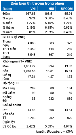 Thị trường nối dài xu hướng hồi phục sang phiên thứ 2 liên tiếp nhờ nhóm bluechip tích cực. Chỉ số VN-Index đóng cửa tại 937.68 điểm tương ứng mức tăng 0.32%. Chỉ số HNX-Index tăng mạnh 3.57% chốt tại 108.51 điểm trong khi Upcom-Index tăng nhẹ 0.44%. Giá trị giao dịch khớp lệnh tăng mạnh đạt hơn 3,900 tỷ đồng trên toàn thị trường.