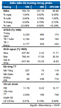 Thị trường tiếp diễn xu hướng tăng nhưng VN-Index rung lắc mạnh tại ngưỡng 775 điểm. Chỉ số VN-Index chốt phiên tại 765.79 điểm tăng 1.04%. Chỉ số HNX-Index cũng đồng thuận tăng 0.92% đóng cửa tại 107.16 điểm; chỉ số Upcom-Index tăng 0.45%. Điểm trừ hiện tại là dòng tiền sụt giảm phiên thứ 2 liên tiếp khi giá trị giao dịch khớp lệnh toàn thị trường đạt 3,600 tỷ đồng.