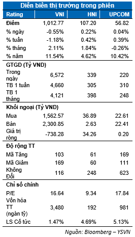 VN-Index tiếp tục điều chỉnh khi áp lực bán vẫn đeo bám ở nhóm bluechip. Chỉ số chốt phiên giảm 0.55% chốt tại 1012.77 điểm. Chỉ số HNX-Index tăng 0.22% dừng tại 107.2 điểm. Giá trị giao dịch khớp lệnh toàn thị trường đạt hơn 4,200 tỷ đồng tăng nhẹ so với phiên liền trước.