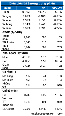 Thị trường tiếp tục có sự phân hóa khi chỉ số VN-Index tăng nhẹ 0.07% dừng tại 967.56 điểm. Các chỉ số sàn Hà Nội giảm nhẹ khi HNX-Index giảm 0.17% chốt tại 103.19 điểm, Upcom-Index giảm 0.61%. Giá trị giao dịch khớp lệnh không có nhiêu thay đổi so với phiên liền trước đạt mức 2,250 tỷ đồng trên toàn thị trường.