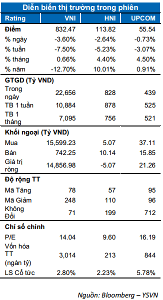 Chỉ số VN-Index đóng cửa giảm 3.6% dừng tại mốc 832.47 điểm . Đây là mức thấp nhất trong ngày cũng như 5 phiên gần đây nhất. Chỉ số HNX-Index giảm 2.64% neo tại 113.82 điểm; chỉ số Upcom-Index giảm 0.74%. Giá trị giao dịch khớp lệnh toàn thị trường đạt 7,460 tỷ đồng. Cần lưu ý VHM được giao dịch thoả thuận đột biến hơn 15,100 tỷ đồng.