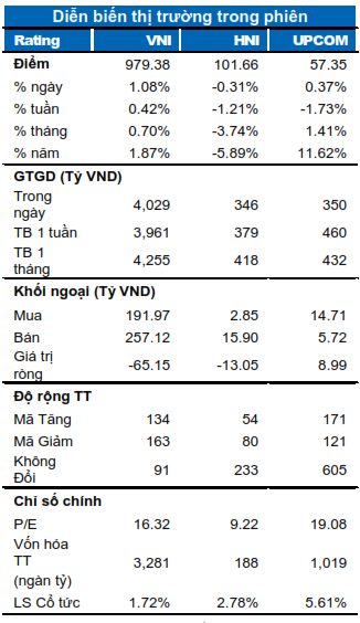 Thị trường chứng khoán Việt Nam đảo chiều ngoạn mục mặc dù co1 lúc giảm sâu hơn 1%. VN-Index đóng cửa tăng 1.08% dừng tại 979.38 điểm trong khi chỉ số HNX-Index thu hẹp đà giảm còn 0.32% dừng tại 101.66 điểm, chỉ số Upcom-Index tăng 0.36% neo tại 57.35 điểm. Giá trị giao dịch đạt 3,425 tỷ đồng khớp lệnh trên cả ba sàn.