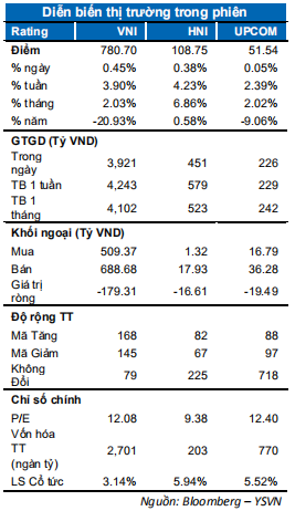 VN-Index giằng co mạnh trong phần lớn thời gian của phiên giao dịch khi tâm lý thận trọng trong phiên đáo hạn hợp đồng tương lai T4. Các chỉ số sàn HSX bất ngờ đảo chiều trong phiên ATC với VN-Index chốt phiên tại 780.7 điểm tăng 0.45%. Chỉ số HNX-Index tăng 0.38% đóng cửa tại 108.75 điểm; chỉ số Upcom-Index không có nhiều biên động khi đóng cửa gần như không thay đổi. Giá trị giao dịch khớp lệnh toàn thị trường đạt tầm 3,600 tỷ đồng giảm gần 15% so với phiên liền trước.