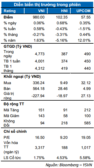 Thị trường chứng khoán Việt Nam có phiên giao dịch cuối tuần “vui nhưng không trọn vẹn” khi VN-Index có lúc tăng mạnh gần 10 điểm nhưng xóa bỏ gần hết thành quả về cuối phiên. VN-Index đóng cửa chỉ còn tăng 0.06% dừng tại 980 điểm trong khi chỉ số HNX-Index tăng khá hơn với mức tăng 0.67% dừng tại 102.35 điểm, chỉ số Upcom-Index tăng 0.34% neo tại 57.55 điểm. Thanh khoản tăng khá mạnh trên sàn HOSE nhờ dòng tiền tham gia vào cổ phiếu trong rổ VN30-Index.