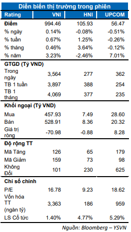 Thị trường tiếp tục biến động trong vùng hẹp. VN-Index đi ngang trong vùng 994-998 điểm, chốt phiên tăng nhẹ dừng tại 994.46 điểm. Chỉ số HNX-Index giảm 0.07% tạm dừng ở 105.93 điểm. Chỉ số Upcom-Index giảm 0.51% chốt tại 56.47 điểm. Giá trị khớp lệnh đạt 3,300 tỷ đồng trên toàn thị trường.