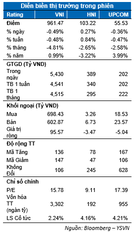 Thị trường chứng khoán Việt Nam tiếp tục giao dịch ảm đạm mặc dù thông tin tích cực từ từ thê giới phiên cuối tuần. Chỉ số VN-Index giảm phiên thứ 2 liên tiếp với mức giảm 0.49% dừng tại 961.47 điểm. Trong khi đó, chỉ số HNX-Index tăng 0.27% và Upcom-Index giảm 0.36%. Giá trị giao dịch khớp lệnh duy trì ở mức trung bình đạt khoảng 3,450 tỷ đồng trên cả ba sàn.