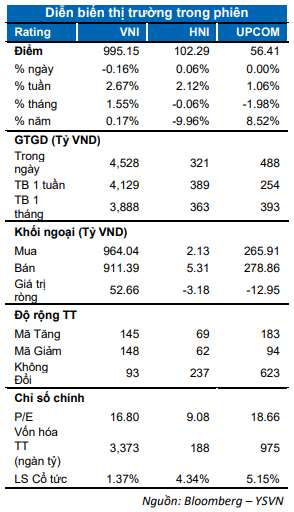 Nhà đầu tư tỏ ra thận trọng trước kỳ cơ cấu Q3 của 2 quỹ ETF cũng như cuộc hợp của FED diễn ra tuần này. VN-Index rung lắc tại khi tiệm cận ngưỡng tâm lý 1,000 điểm. Chỉ số đóng cửa giảm nhẹ 0.16% dừng tại 995.15 điểm. Chỉ số HNX-Index tăng 0.06% đóng cửa tại 102.29 điểm trong khi Upcom-Index nhích nhẹ 0.01% neo tại 56.41 điểm. Dòng tiền tiếp tục tham gia tích cực với 3,600 tỷ đồng khớp lệnh.