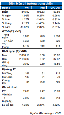 Sau phiên bùng nổ liền trước, thị trường tiếp tục duy trì quán tính tăng trong phiên hôm nay. Mặc dù đối diện với áp lực chốt lời từ khoảng gần 14h, các chỉ số vẫn đóng cửa ở vùng cao. Chỉ số VN-Index đóng cửa tại 845.92 điểm tăng 1.06%. Chỉ số HNX-Index chốt tại 108.83 điểm tăng 0.26%; chỉ số Upcom-Index tăng 0.96% chốt tại 53.80 điểm. Thanh khoản tăng mạnh lên 6,200 tỷ đồng khớp lệnh trên cả 3 sàn.