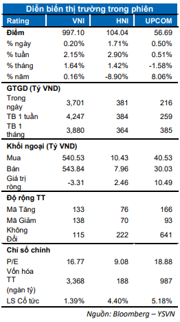 Lực cầu bắt đáy kích hoạt trong phiên chiều giúp VN-Index đảo chiều thành công. Chỉ số VN-Index đóng cửa tăng nhẹ 0.2% dừng tại 997.1 điểm. Tâm điểm hôm nay thuộc về sàn Hà Nội khi chỉ số HNX-Index tăng mạnh 1.71% đóng cửa tại 104.04 điểm trong khi Upcom-Index tăng 0.5% neo tại 56.69 điểm. Giá trị giao dịch khớp lệnh đạt hơn 3,300 tỷ đồng trên cả ba sàn.