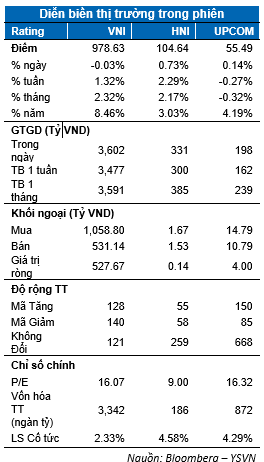VN-Index biến động hẹp phiên đầu tuần chốt phiên tại 978.63 điểm giảm nhẹ 0.03%. Chỉ số HNX-Index tăng mạnh 0.73% chốt tại 104.64 điểm trong khi Upcom-Index tăng nhẹ. Ảnh hưởng từ kỳ nghỉ lễ dài đã tác động lên thanh khoản. Cụ thể, giá trị giao dịch khớp lệnh đạt khoảng 2,500 tỷ đồng trên toàn thị trường.