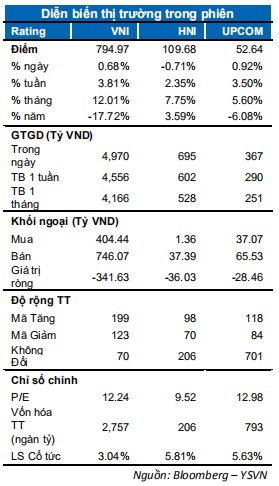 Thị trường tiếp tục nối dài đà tăng nhưng đi kèm với tình trạng phân hoá mạnh. Chỉ số VN-Index đóng cửa tăng 0.68% dừng tại 794.97 điểm mặc dù trong phiên có lúc tăng 1% áp sát ngưỡng 800 điểm. HNX-Index đóng cửa giảm 0.71% neo tại 109.68 điểm; chỉ số Upcom-Index tăng 0.93%. Giá trị giao dịch khớp lệnh toàn thị trường tiếp tục tăng lên mức 5,300 tỷ đồng.