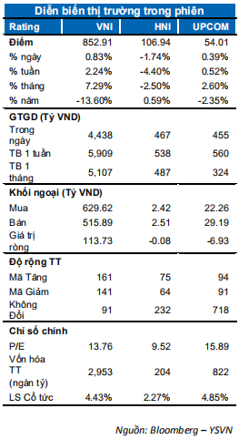 Thị trường giao dịch khá giằng co và dần hồi phục chậm chạp về cuối phiên nhờ một số trụ lớn. Chỉ số VN-Index đóng cửa tại 852.91 điểm tăng 0.83%. Chỉ số HNX-Index ngược lại yếu hơn khi giảm 1.74% chốt tại 106.94 điểm; chỉ số Upcom-Index tăng 0.39% chốt tại 54.01 điểm. Thanh khoản đạt gần 4,600 tỷ đồng khớp lệnh trên cả 3 sàn giảm gần 26% so với phiên liền trước.