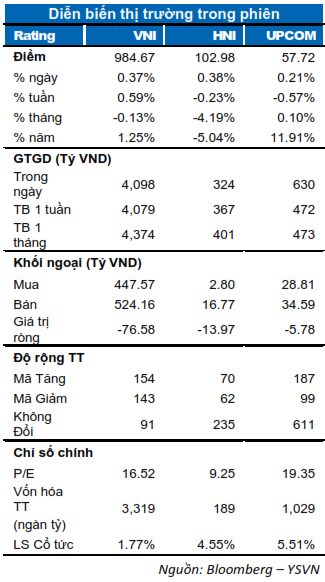 Nối tiếp nhịp hồi phục cuối phiên liền trước, VN-Index tiếp tục đà tăng nhưng mức tăng không đáng kể. Chỉ số đóng cửa tăng 0.37% dừng tại 984.67 điểm trong khi chỉ số HNX-Index cũng tăng 0.38% dừng tại 102.98 điểm, chỉ số Upcom-Index tăng 0.21% neo tại 57.72 điểm. Giá trị giao dịch cải thiện nhẹ với 3,462 tỷ đồng khớp lệnh trên cả ba sàn.