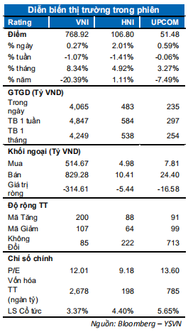 Sau phiên giảm mạnh liền trước, quán tính giảm duy trì ở đầu phiên giao dịch khiến VN-Index giảm về 750 điểm. Giao dịch ổn định trở lại giúp chỉ số hồi phục và duy trì sắc xanh cho tới cuối phiên. Chỉ số VN-Index đóng cửa phiên tăng 0.27% dừng tại 768.92 điểm. Chỉ số HNX-Index đảo chiều tăng mạnh 2.01% neo tại 106.8 điểm; chỉ số Upcom-Index cũng đồng thuận tăng 0.55%. Điểm trừ là giá trị giao dịch khớp lệnh toàn thị sụt giảm mạnh vể mức 4,000 tỷ đồng giảm 34% so với phiên liền trước.