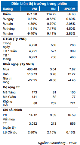 TTCK thế giới không có nhiều biến động trong phiên hôm nay. Trong khi đó, TTCK Việt Nam tiếp tục phục hồi với nhịp tăng giảm đang xen trong phiên. Chỉ số VN-Index kết thúc phiên tại 871.28 điểm, tăng 0.31%. Chỉ số HNX-Index ngược chiều giảm nhẹ 0.55% neo tại 114.72 điểm; chỉ số Upcom-Index cũng nối gót tăng 0.6%. Sau phiên cơ cấu cuối tuần trước, giá trị giao dịch khớp lệnh toàn thị trường đạt mức 5,100 tỷ đồng vẫn duy trì ở mức cao.