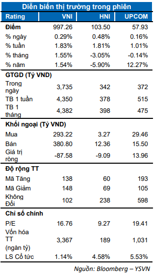 Thị trường nối dài đà tăng lên phiên thứ 3 liên tiếp nhưng cũng đối diện với áp lực chốt lời mạnh khi VN-Index tiệm cận ngưỡng tâm lý 1,000 điểm. VN-Index đóng cửa tăng 0.29% dừng tại 997.26 điểm. Chỉ số HNX-Index tăng 0.47% dừng tại 103.5 điểm, ngược lại chỉ số Upcom-Index giảm 0.04% neo tại 57.81 điểm. Giá trị giao dịch toàn thị trường sụt giảm so với phiên liền trước khi đạt 3,485 tỷ đồng giá trị khớp lệnh. Độ rộng thị trường vẫn đang tiêu cực khi VN-Index có 141 mã tăng và 161 mã giảm.
