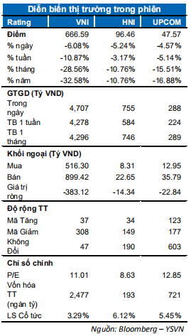 Các chỉ số chứng khoán Thế giới và khu vực ngoại trừ Nhật Bản tiếp tục diễn biến tiêu cực. Chỉ số VN-Index ghi nhận mức giảm 6.08% dừng tại 666.59 điểm. Chỉ số HNX-Index giảm 5.24% đóng cửa tại 96.46 điểm trong khi Upcom-Index cũng giảm 4.58%. Giá trị giao dịch khớp lệnh đạt 4,100 tỷ đồng toàn thị trường giảm nếu so sánh với các phiên giảm mạnh tương tự trước đây.