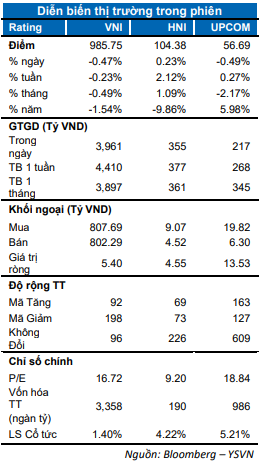 Lực bán áp đảo về cuối phiên khiến VN-Index đảo chiều giảm gần 5 điểm  tương ứng 0.47% đóng cửa tại 985.75 điểm. Chỉ số HNX-Index ngược lại tăng nhẹ 0.23% đóng cửa tại 104.38 điểm trong khi Upcom-Index giảm 0.49% neo tại 56.69 điểm. Giá trị giao dịch khớp lệnh đạt hơn 3,000 tỷ đồng trên cả ba sàn.