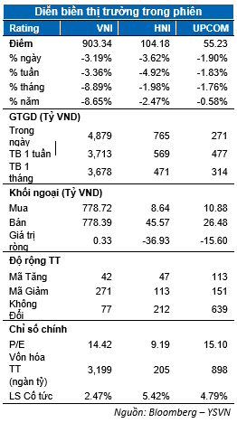 Thị trường phản ứng tiêu cực trước thông tin dịch bệnh nCov-19 vẫn chưa có dấu hiệu thuyên giảm khi số cả mắc bệnh tại Hàn Quốc gia tăng mạnh. Chỉ số VN-Index giảm sâu ngay từ lúc mở của và kết phiên với mức giảm 3.19% dừng tại 903.34 điểm. Chỉ số HNX-Index giảm 3.62% đóng cửa tại 104.18 điểm trong khi Upcom-Index cũng mất 1.9%. Giá trị giao dịch khớp lệnh tăng mạnh khi đạt 5,050 tỷ đồng trên toàn thị trường.