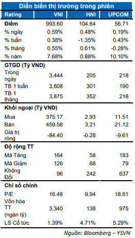 Thị trường gia tăng chậm rãi nhưng khá vững chắc. Cụ thể, chỉ số VN-Index tăng 0.59% đóng cửa ở mức cao nhất phiện tương ứng 993.6 điểm. Trong khi đó, chỉ số HNX-Index cũng tăng 0.9% trong khi Upcom-Index chỉ tăng nhẹ trên tham chiếu. Giá trị khớp lệnh tăng so với phiên liền trước đạt 3,400 tỷ đồng trên toàn thị trường.