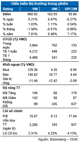 VN-Index tiếp tục diễn biến hồi phục với mức tăng 0.21% đóng cửa tại 960.92 điểm. Chỉ số HNX-Index tăng 0.47% neo tại 102.93 điểm trong khi Upcom-Index giảm 0.27% dừng tại 55.6 điểm. Dòng tiền duy trì ở mức trung bình với giá trị giao dịch khớp lệnh đạt mức hơn 3,100 tỷ đồng.