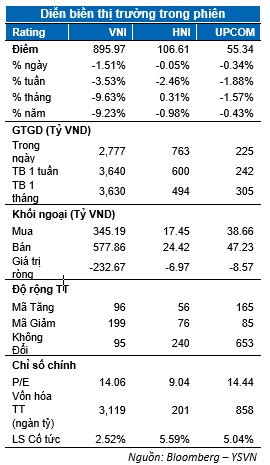 Các chỉ số chứng khoán Việt Nam tiếp tục diễn biến thận trọng nhưng mức độ biến động giảm đã không còn mạnh như trước. Cụ thể, chỉ số VN-Index đóng cửa với mức giảm 1.51% dừng tại 895.97 điểm sát vùng đáy cũ quanh 892 điểm. Chỉ số HNX-Index giảm 0.05% đóng cửa tại 106.61 điểm trong khi Upcom-Index cũng giảm 0.34%. Mặc dù giảm điểm nhưng giá trị giao dịch khớp lệnh tiêp tục suy giảm khi đạt 3,260 tỷ đồng cho thấy lực bán đang có dấu hiệu suy yếu.