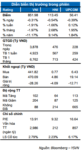 Thị trường xuất hiện “bẫy tăng giá”(bulltrap) khi hồi phục ngày từ đầu phiên nhưng đã suy giảm trở lại sau đó. Chỉ số VN-Index đóng cửa giảm 0.31% đóng cửa tại 851.98 điểm. Chỉ số HNX-Index giảm 0.54% neo tại 113.457 điểm; chỉ số Upcom-Index cũng có mức giảm tương tự. Giá trị giao dịch khớp lệnh toàn thị trường đạt 3,700 tỷ đồng tiếp tục sụt giảm nhẹ so với phiên liền trước.