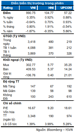 Tâm lý thị trường tích cực giúp các chỉ số tiếp tục xu hướng hồi phục.  VN-Index chốt phiên tăng 0.35% dừng tại 987.3 điểm. Chỉ số HNX-Index tăng khá mạnh 0.92% neo tại 104.77. Chỉ số Upcom-Index tăng 0.88% chốt tại 57.22 điểm. Dòng tiền cải thiện rõ nét khi giá trị giao dịch khớp lệnh tăng lên 3,600 tỷ đồng trên cả ba sàn.