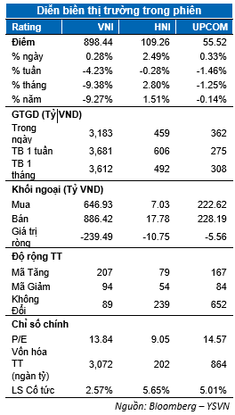 Thị trường diễn biến đầu phiên khá thận trọng khi tâm lý còn sự nghi ngại. Nhóm Ngân hàng diễn tích cực và dần lan tỏa sang nhóm cổ phiếu khác giúp chỉ số VN-Index đóng cửa tăng 0.28% dừng tại 898.44 điểm. Chỉ số HNX-Index tăng mạnh 2.48% đóng cửa tại 109.26 điểm trong khi Upcom-Index cũng nối gót tăng 0.32%. Giá trị giao dịch khớp lệnh xấp xỉ với phiên liền trước đạt gần 3,200 tỷ đồng toàn thị trường.