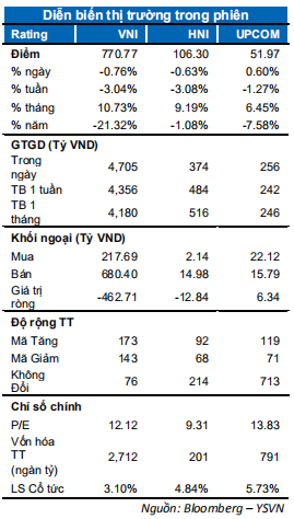 VN-Index tăng mạnh đầu phiên nhưng thất bại trước ngưỡng 785 điểm cũng là lần thứ 2 thoái lùi từ ngưỡng này. Chỉ số đóng cửa phiên tại 770.77 điểm giảm 0.76%. Chỉ số HNX-Index cũng đồng thuận giảm 0.63% neo tại 106.3 điểm; chỉ số Upcom-Index ngược chiều khi tăng 0.6%. Giá trị giao dịch khớp lệnh toàn thị trường tăng nhẹ lên mức 4,250 tỷ đồng trong phiên giảm điểm hôm nay đang là tín hiệu tiêu cực.
